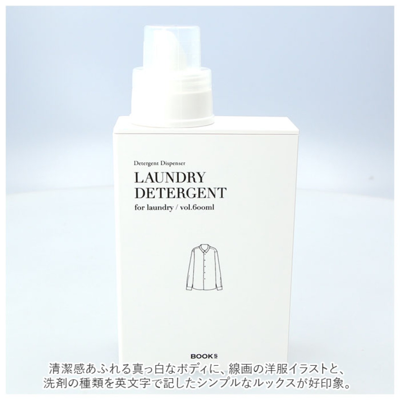 ・清潔感あふれる真っ白なボディに、線画の洋服イラストと、洗剤の種類を英文字で記したシンプルなルックスが好印象。