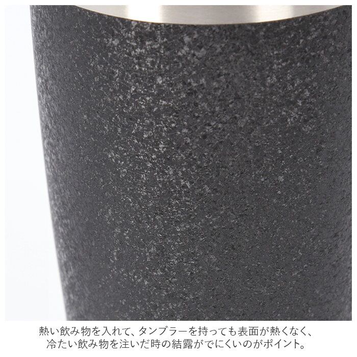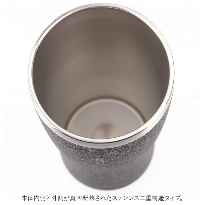 ・本体内側と外側が真空断熱されたステンレス二重構造タイプ。熱い飲み物を入れて、タンブラーを持っても表面が熱くなく、冷たい飲み物を注いだ時の結露がでにくいのがポイント。