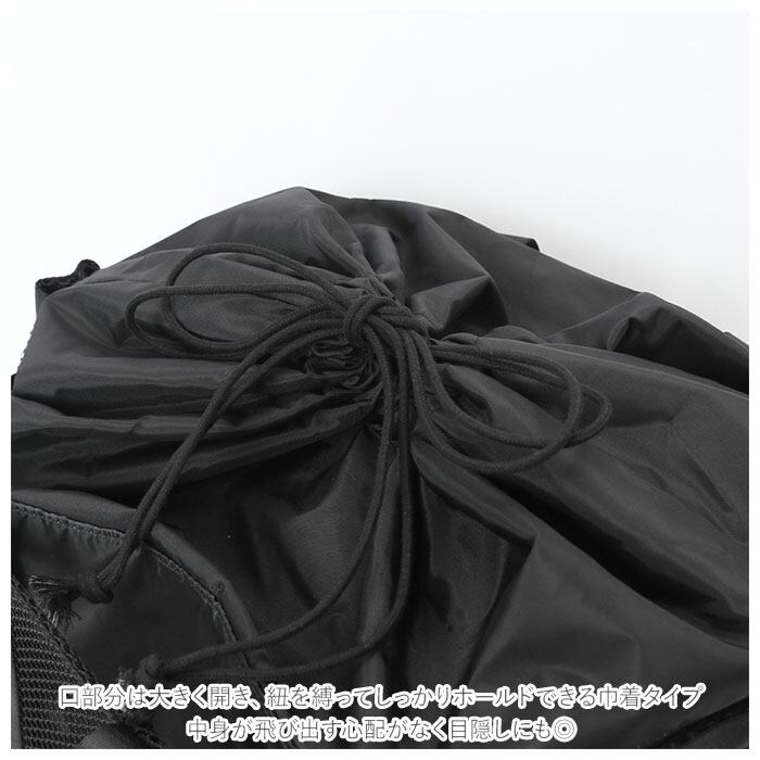 ・口部分は大きく開き、紐を縛ってしっかりホールドできる巾着タイプ。中身が飛び出す心配がなく目隠しにも◎