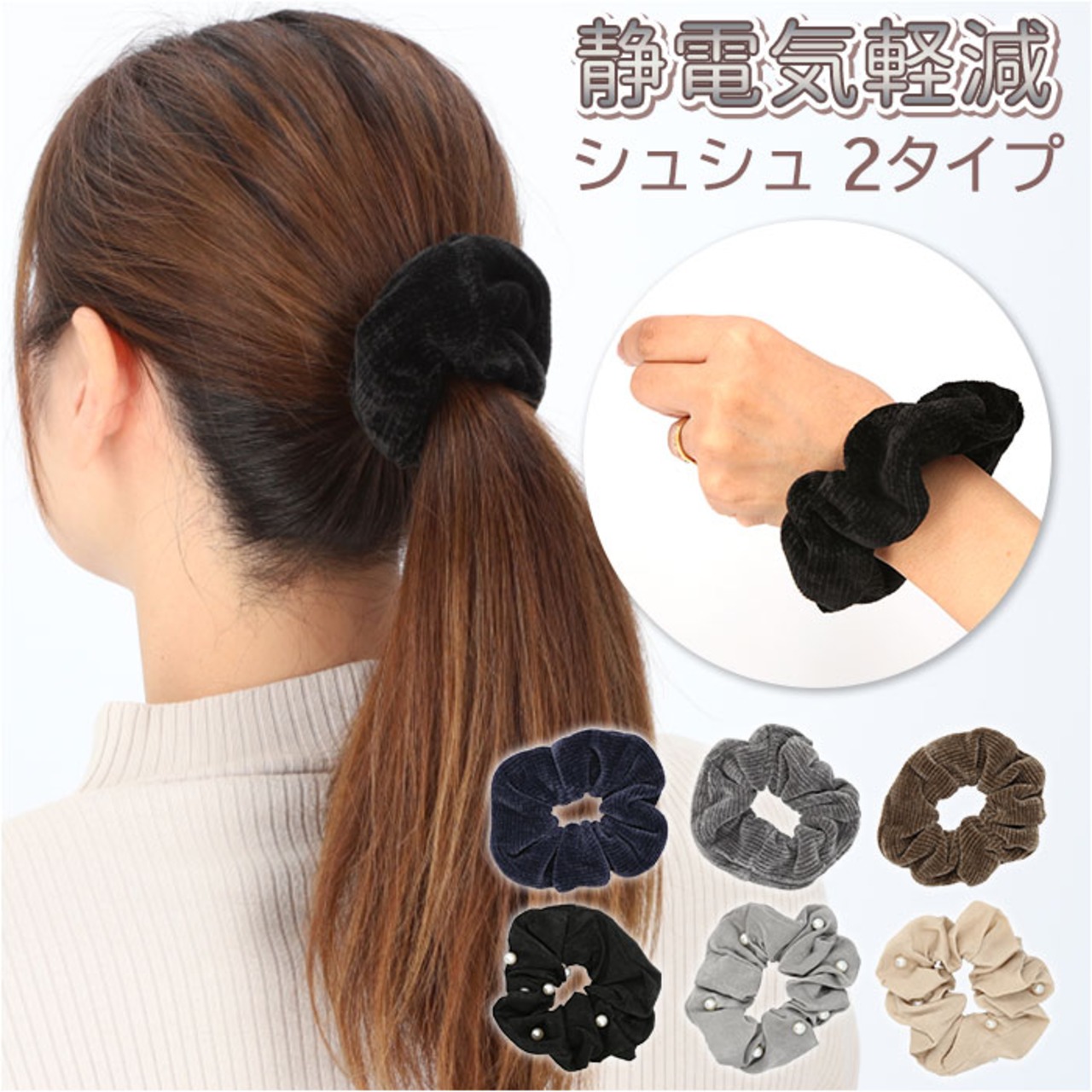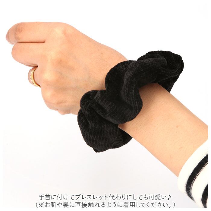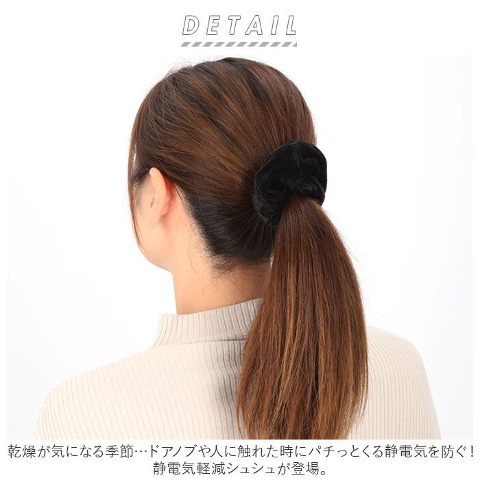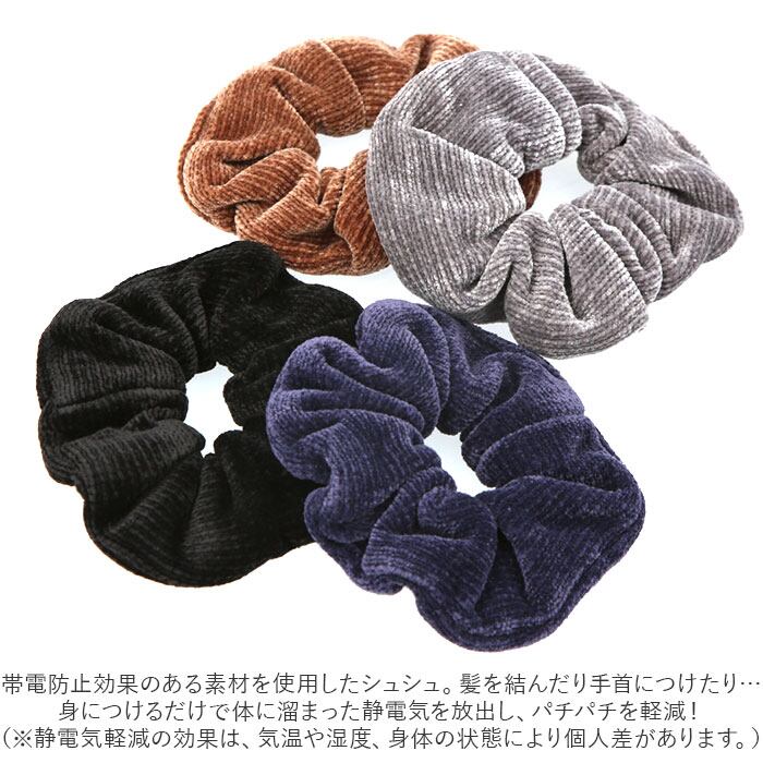 ・帯電防止効果のある素材を使用したシュシュ。髪を結んだり手首につけたり…身につけるだけで体に溜まった静電気を放出し、パチパチを軽減!(※静電気軽減の効果は、気温や湿度、身体の状態により個人差があります。)