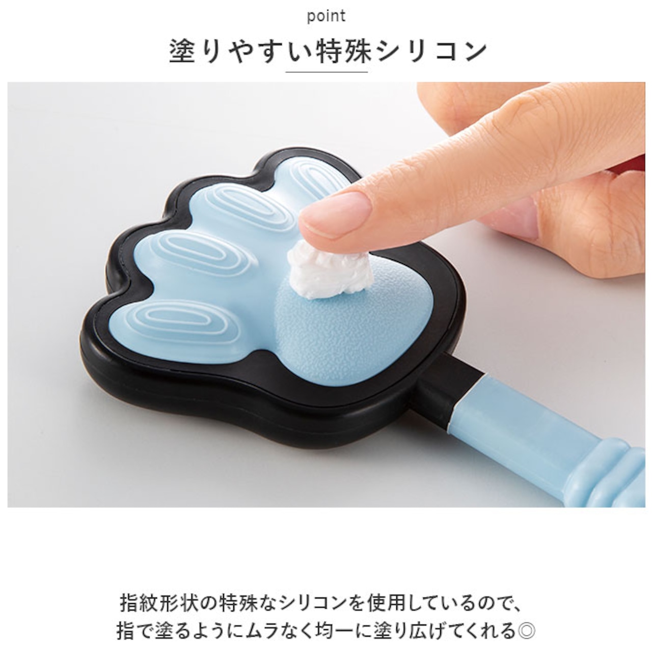 ・指紋形状の特殊なシリコンを使用しているので、指で塗るようにムラなく均一に塗り広げてくれる◎