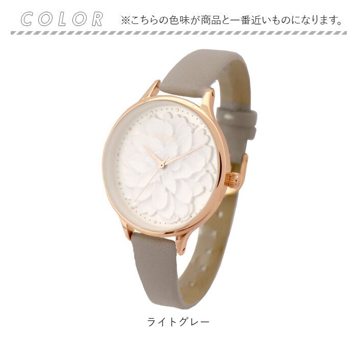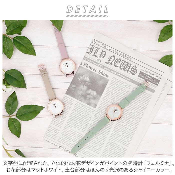 ・文字盤に配置された、立体的なお花デザインがポイントの腕時計「フェルミナ」。