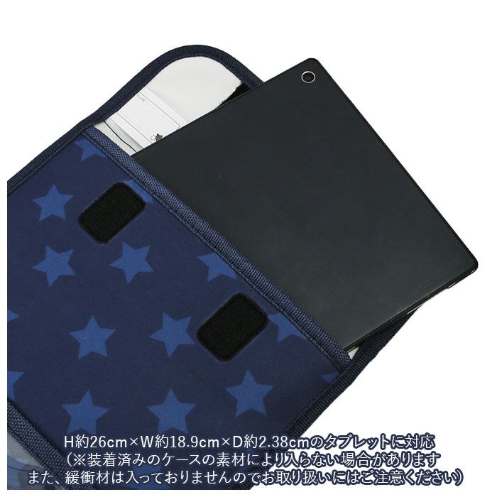 [縦]約26cm/[横幅]約18.9cm/[厚み]約2.38cmのタブレットに対応。(※装着済みのケースの素材により入らない場合があります。また、本製品には緩衝材が入っておりませんので、電子機器を入れる場合はお取り扱いにご注意ください。)