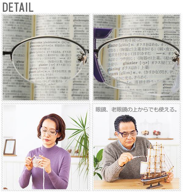 メガネの上からかけて使えるゆったりした作りなので、細かい作業や細かい文字が見えやすく、両手が使えます。