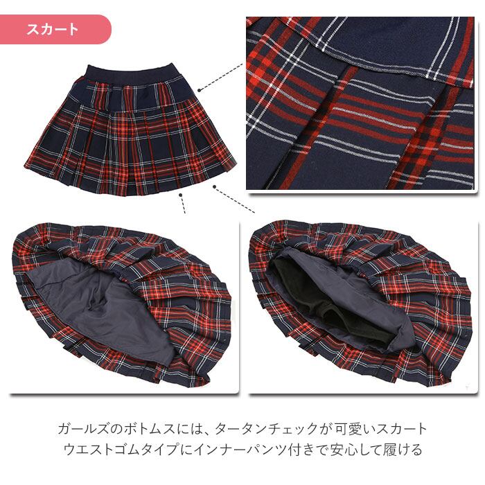 ・ガールズのボトムスには、タータンチェックが可愛いスカート。ウエストゴムタイプにインナーパンツ付きで安心して履ける。