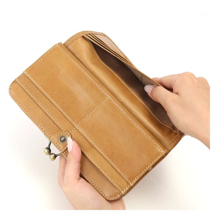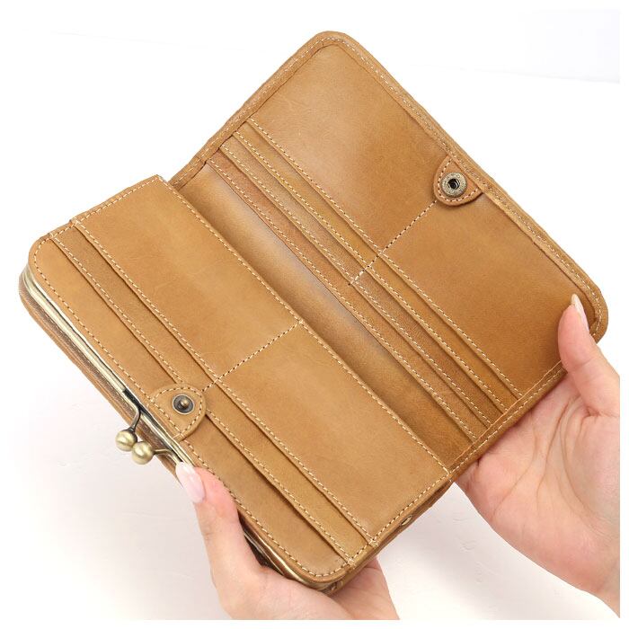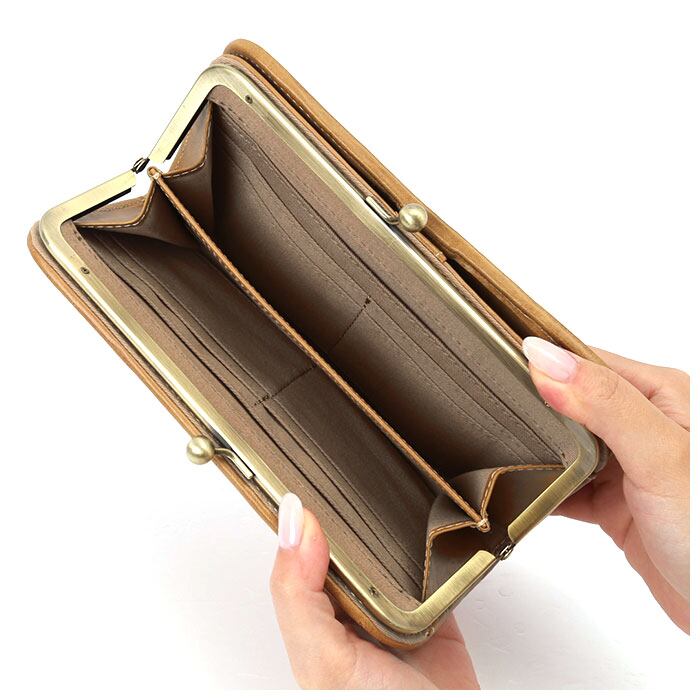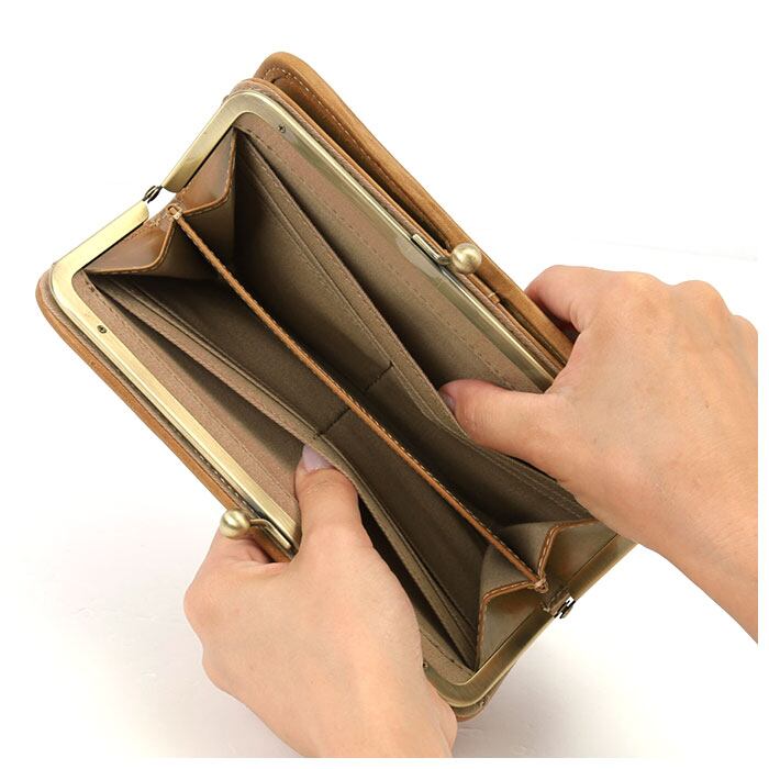 ・メイン収納はがま口で大きく開くので、お金もカードも出し入れがしやすい!札入れ収納×2、カードポケット×8、フリーポケット×2を装備。