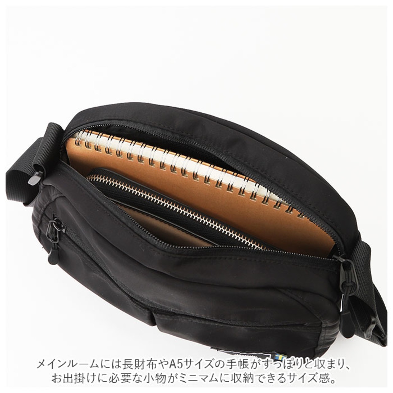 ・メインルームには長財布やA5サイズの手帳がすっぽりと収まり、お出掛けに必要な小物がミニマムに収納できるサイズ感。