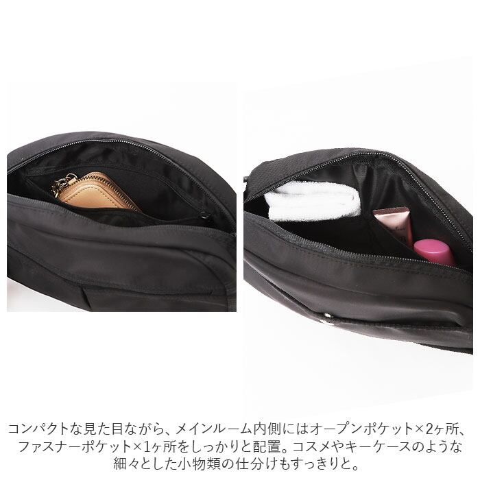 ・コンパクトな見た目ながら、メインルーム内側にはオープンポケット×2ヶ所、ファスナーポケット×1ヶ所をしっかりと配置。コスメやキーケースのような細々とした小物類の仕分けもすっきりと。