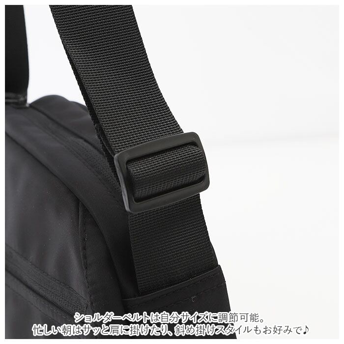 ・ショルダーベルトは自分サイズに調節可能。忙しい朝はサッと肩に掛けたり、斜め掛けスタイルもお好みで♪