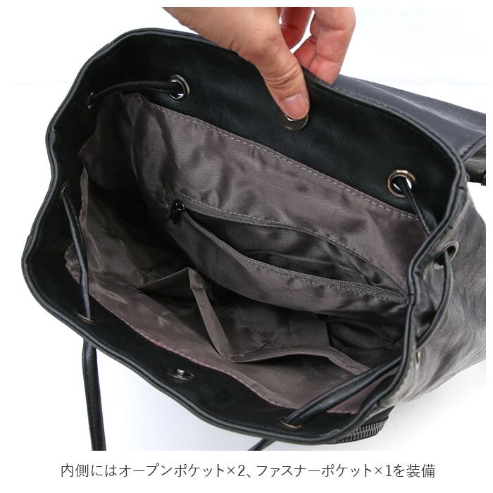 ・メイン収納部の開閉口は調節可能な巾着式タイプ。内側にはオープンポケット×2、ファスナーポケット×1を装備。