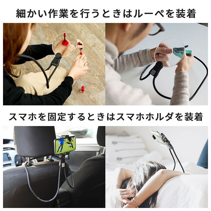 ・小さく見づらいスマホの文字を拡大!首掛け、スタンド、手持ちの1台3役♪smolia(スモリアフリー)検査用拡大鏡 スマホホルダーセット