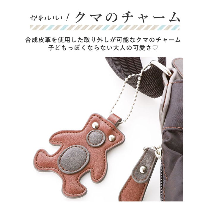 ・ファスナーの持ち手部分やポケットのパイピング、取り外しが可能なくまのキーホルダーなどに合成皮革を使用。ナイロン素材と皮革素材のコンビがお洒落♪