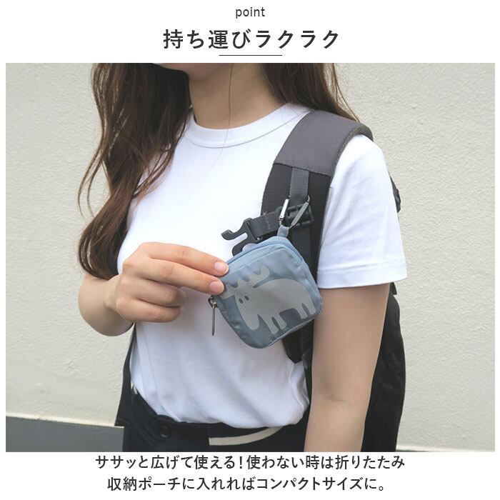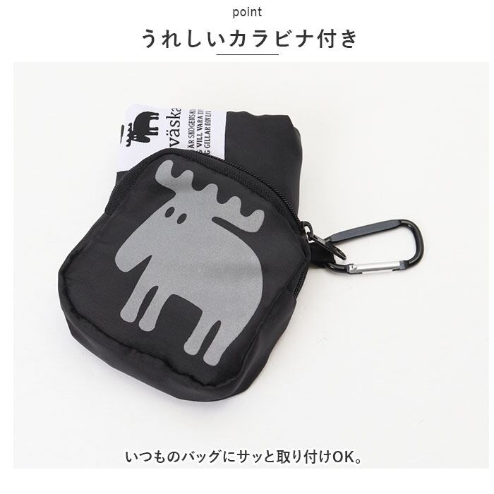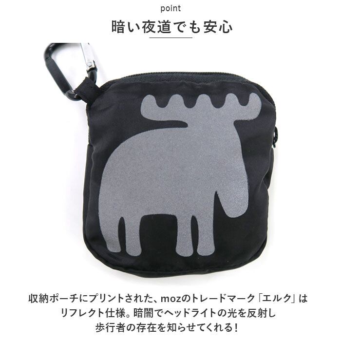 ・収納ポーチにプリントされた、mozのトレードマーク「エルク」はリフレクト仕様。暗闇でヘッドライトの光を反射し、歩行者の存在を知らせてくれる!
