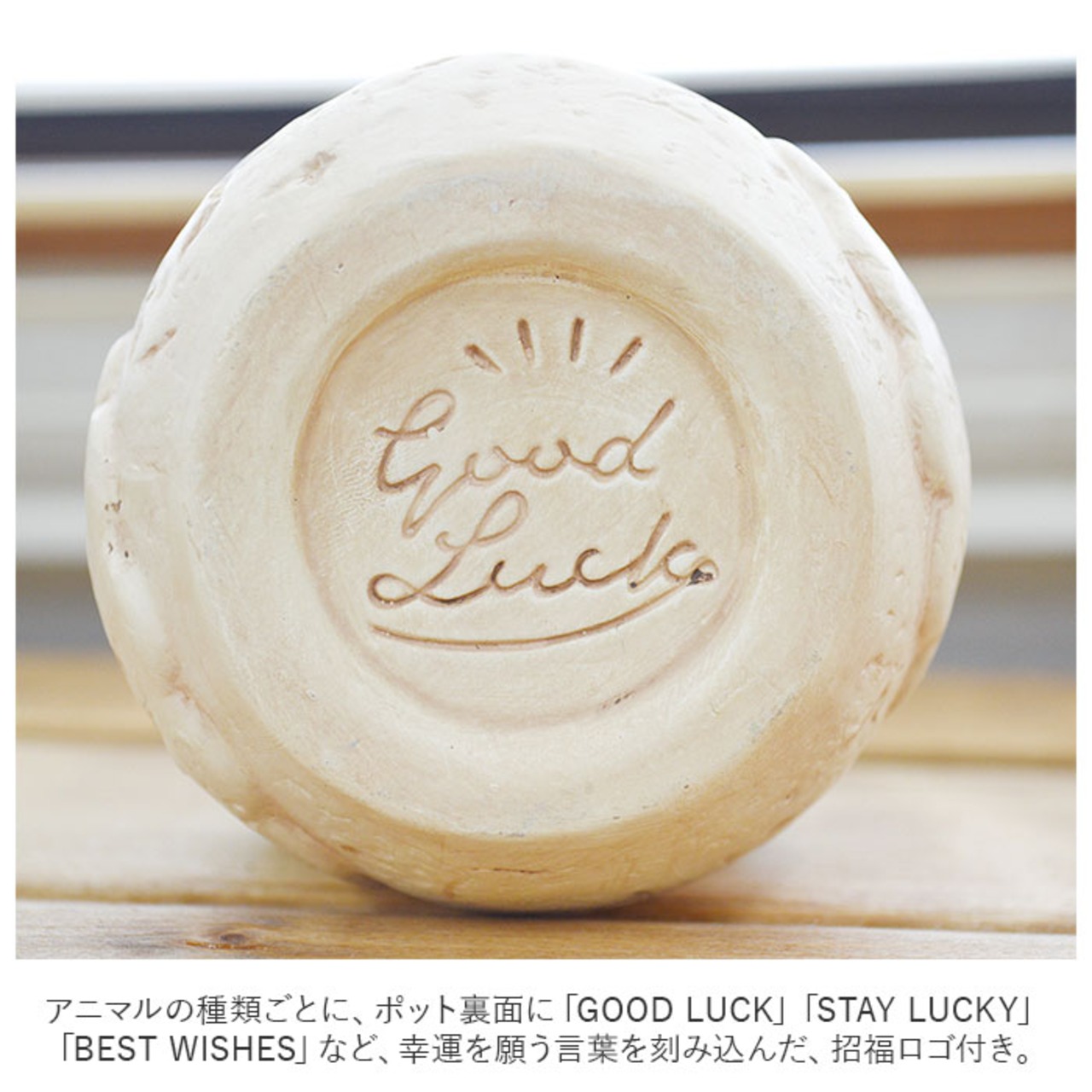 ・アニマルの種類ごとに、ポット裏面に「GOOD LUCK」「STAY LUCKY」「BEST WISHES」など、幸運を願う言葉を刻み込んだ、招福ロゴ付き。
