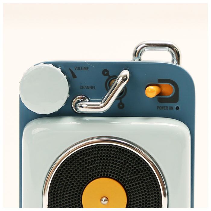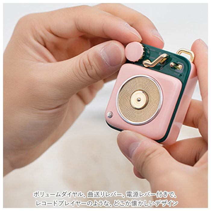 ・ボリュームダイヤル、曲送りレバー、電源レバー付きで、レコードプレイヤーのような、どこか懐かしいデザイン。