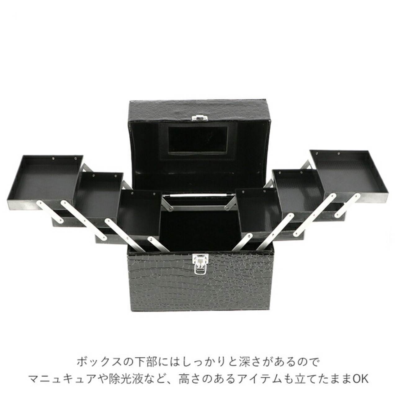 ・左右各3段(全6段)のコスメ用トレーを観音開き状に左右に大きく広げることができる、本格的なつくり。メイクアップアーティスト顔負けのプロ仕様。