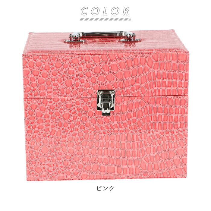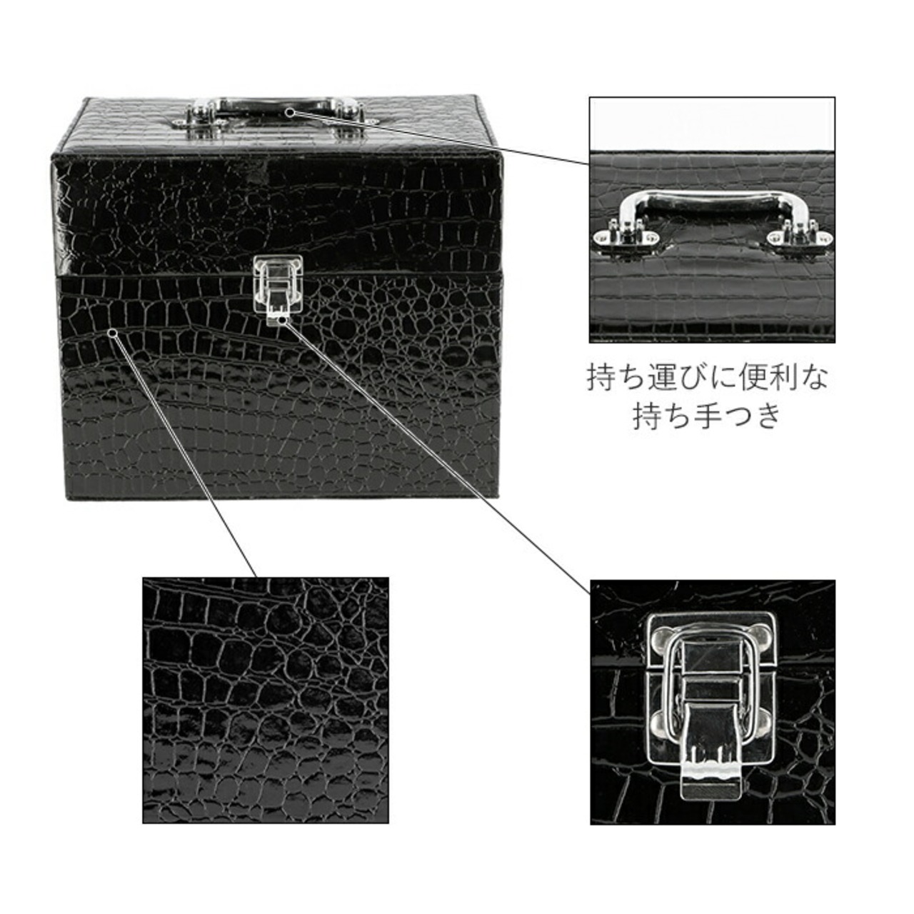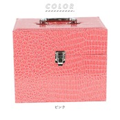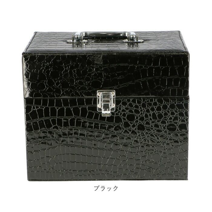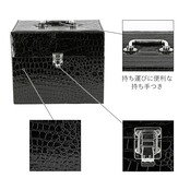 ・しっかりとした持ち手と、エキゾチックで光沢感のあるレプタイル調レザーが印象的なトレイ付きコスメボックス。