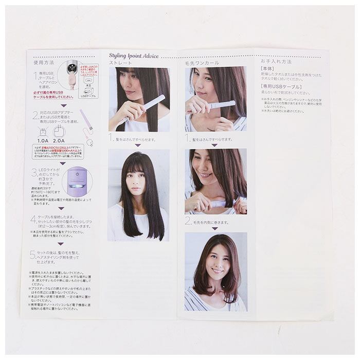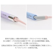・使用する際は、付属の専用USBケーブルとヘアアイロンを連結、次にUSBケーブルを対応のUSBアダプターまたはUSB充電器と連結。(※アダプターは付属しておりません。定格出力DC5V/2A以上のACアダプターやUSB充電器をご用意ください。)