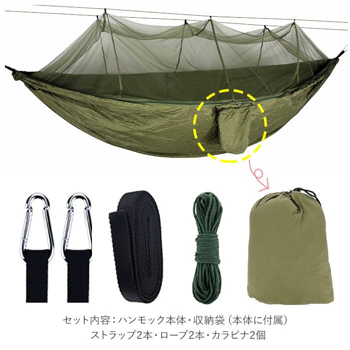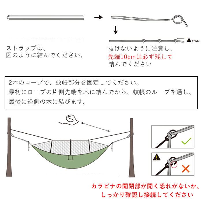 ・セット内容:ハンモック本体・収納袋(本体に付属)・ストラップ2本・ロープ2本・カラビナ2個