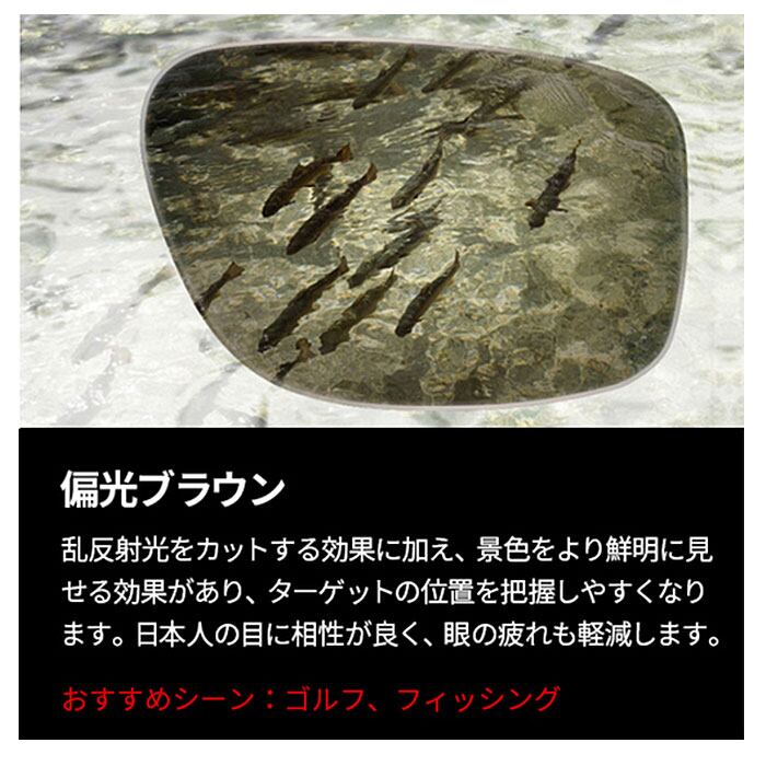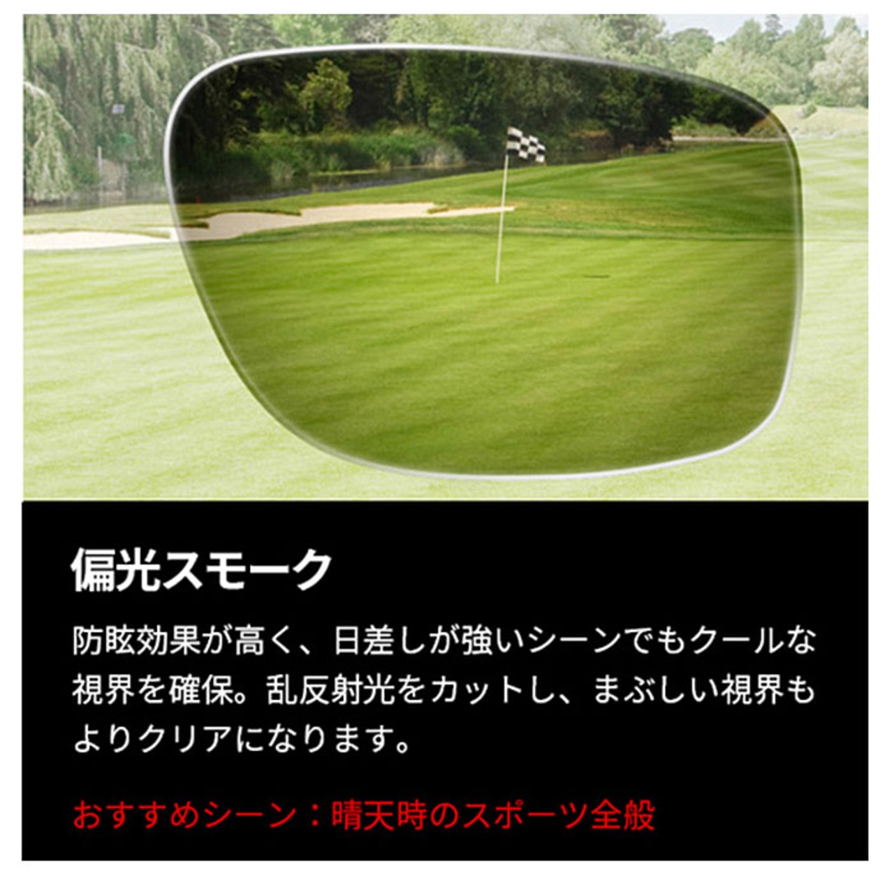 ・路面、ガラス、水面、芝の乱反射をカットする偏光レンズ。芝目も見やすく、海面も見やすい。ゴルフ、釣り、車の運転等アウトドアで重宝。