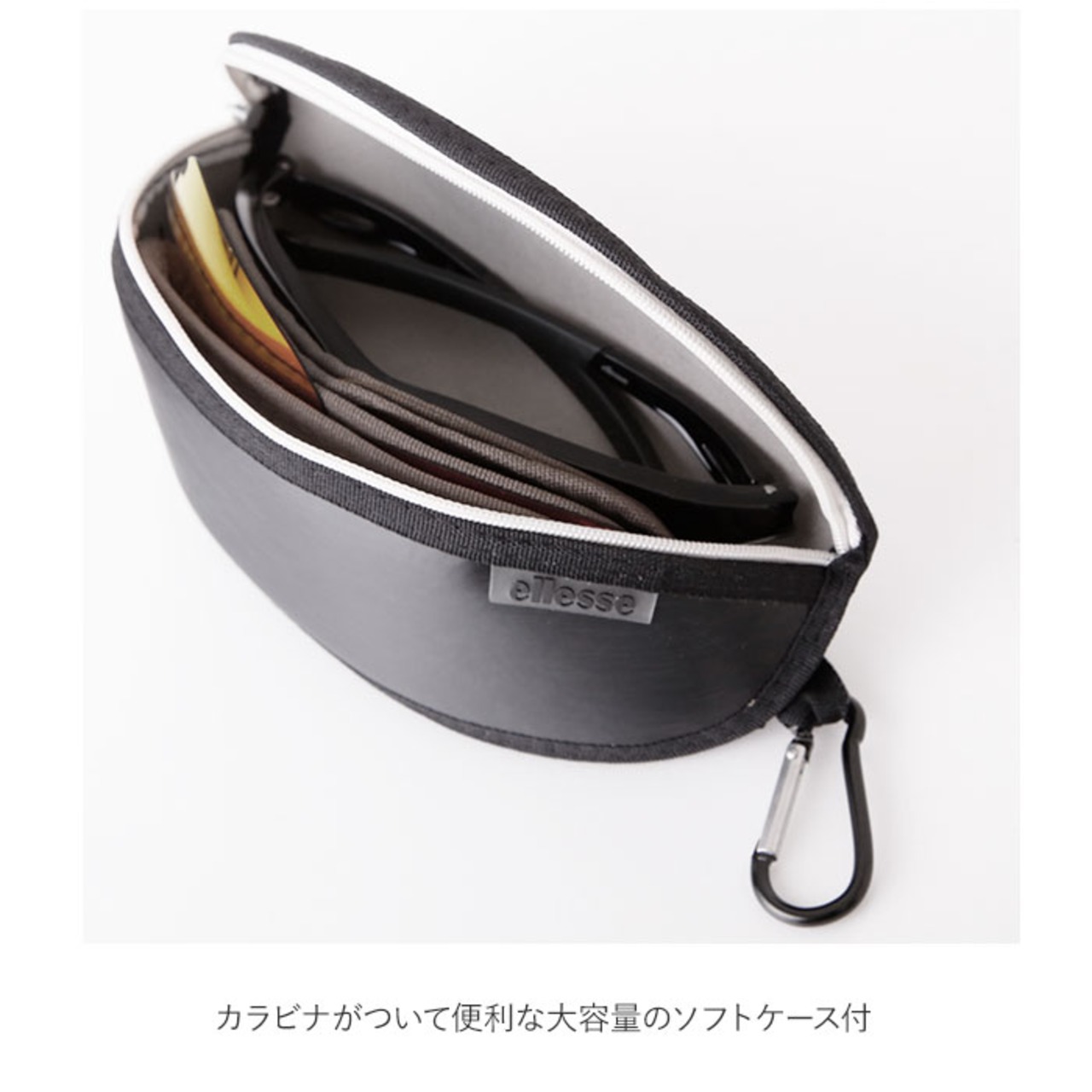 ・サングラス、交換レンズ、レンズクロスがコンパクトに収まる大容量のソフトケース付。カラビナがついて便利。