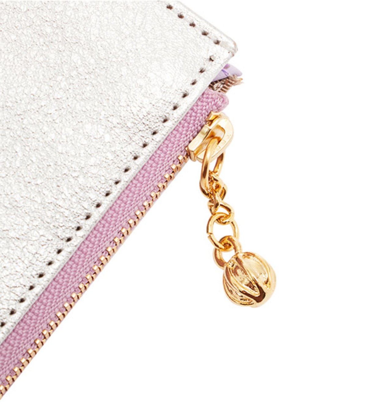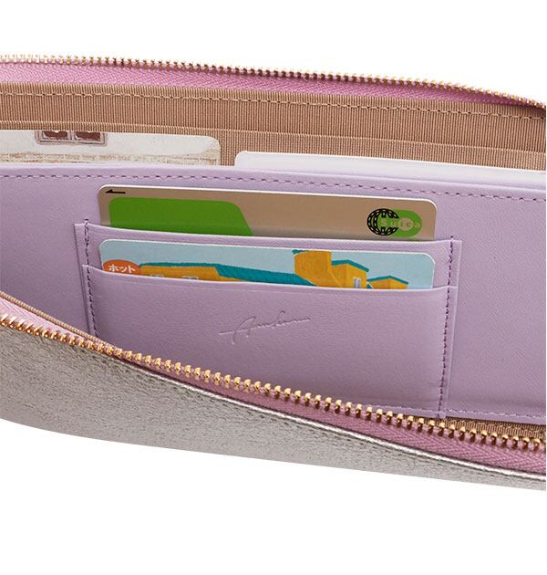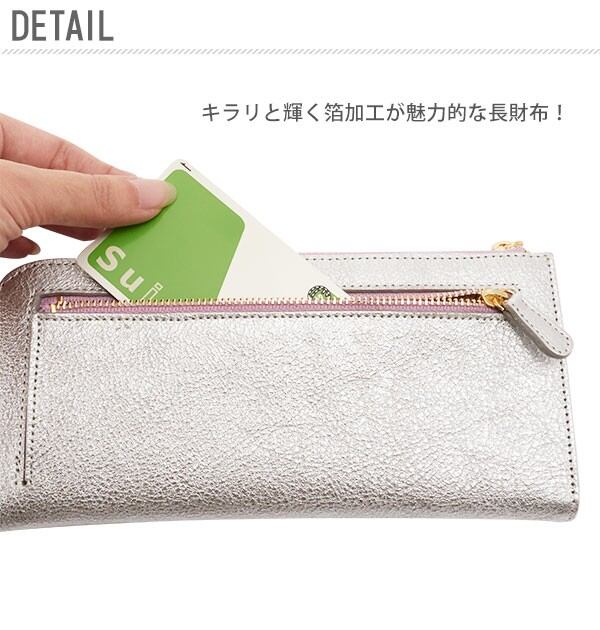 配色のファスナーと内側のレザーがアクセントになった、長財布。表面の質感を活かした、美しい箔加工が目を引くデザインです。急いでいる時にも開閉しやすいL字のファスナー。小銭入れ部分にはファスナーが無いため、L字ファスナーを開けるワンアクションで、全ての中身が確認できます。小銭入れも大きく開いて、取り出しやすさ◎