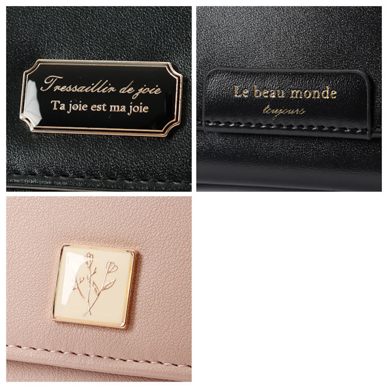 ・柔らかな質感のフェイクレザーに、エレガントなモチーフを控え目に配置。お花の描かれたエポキシ金具や、シンプルな「Le beau monde(美しい世界)」の箔押しロゴ、「Ta joie est ma joie(あなたの喜びは私の喜び)」のロゴプレートなど、バラエティに富んだラインナップ。