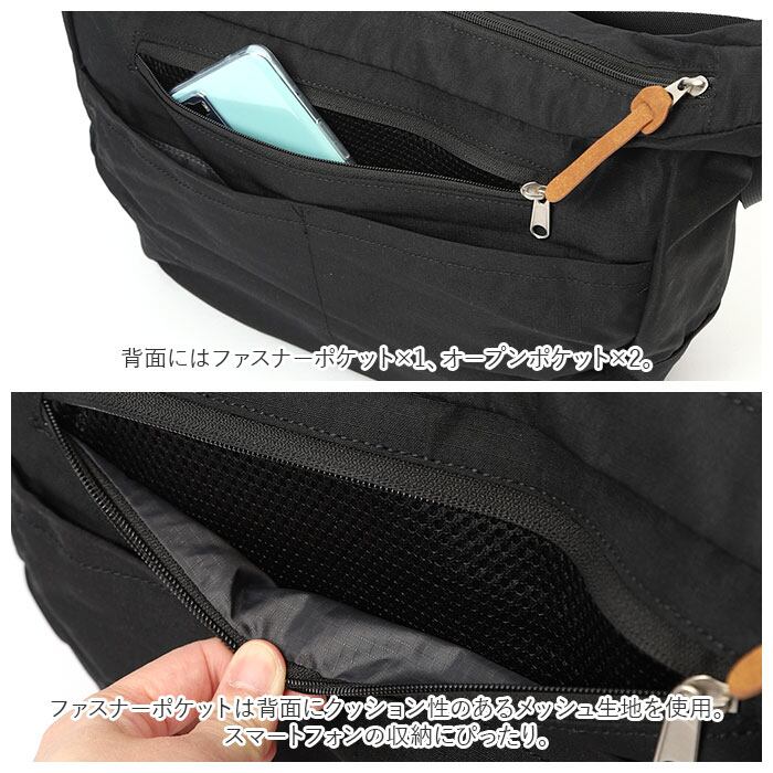 ・背面にはファスナーポケット×1、オープンポケット×2。ファスナーポケットは背面にクッション性のあるメッシュ生地を使用。スマートフォンの収納にぴったり。