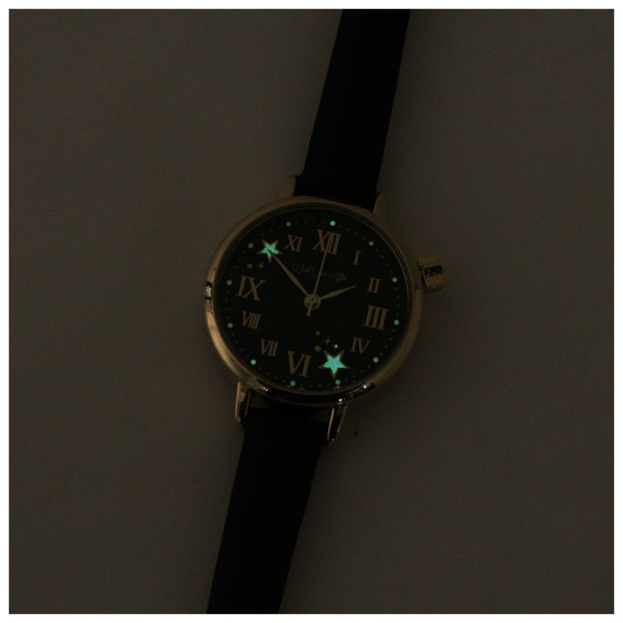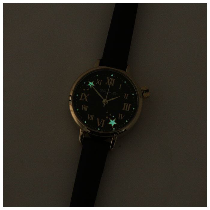 ・文字盤に描かれた星柄部分は蓄光のプリントを採用していて、夜になると光るのがポイント。