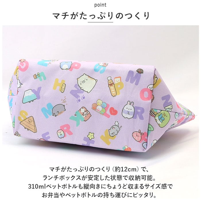 ・マチがたっぷりのつくり(約12cm)で、ランチボックスが安定した状態で収納可能。310mlペットボトルも縦向きにちょうど収まるサイズ感でお弁当やペットボトルの持ち運びにピッタリ。