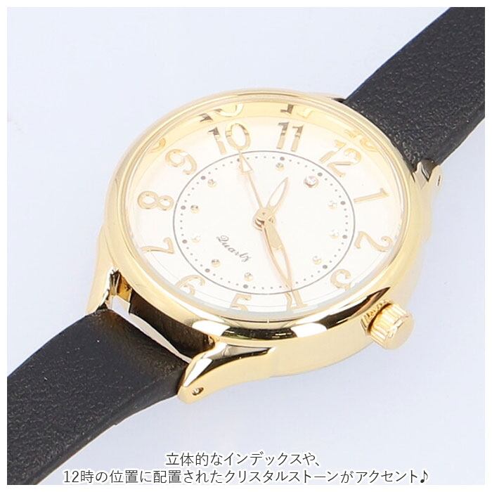 ・立体的なインデックスや、12時の位置に配置されたクリスタルストーンがアクセント♪手を傾けるたびにストーンがキラッと輝くのがポイント。
