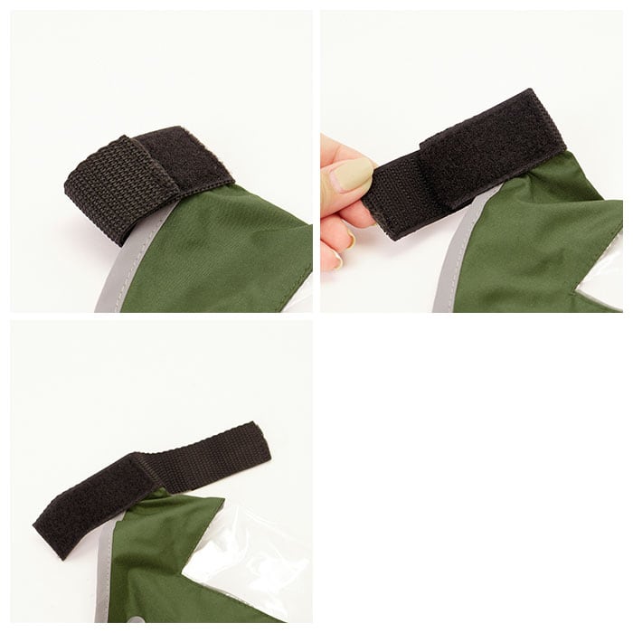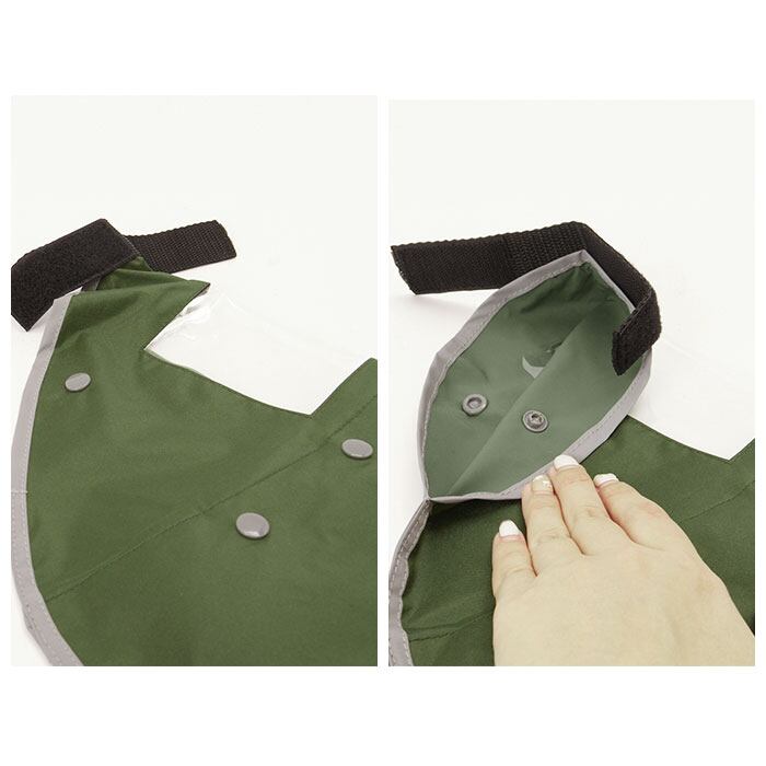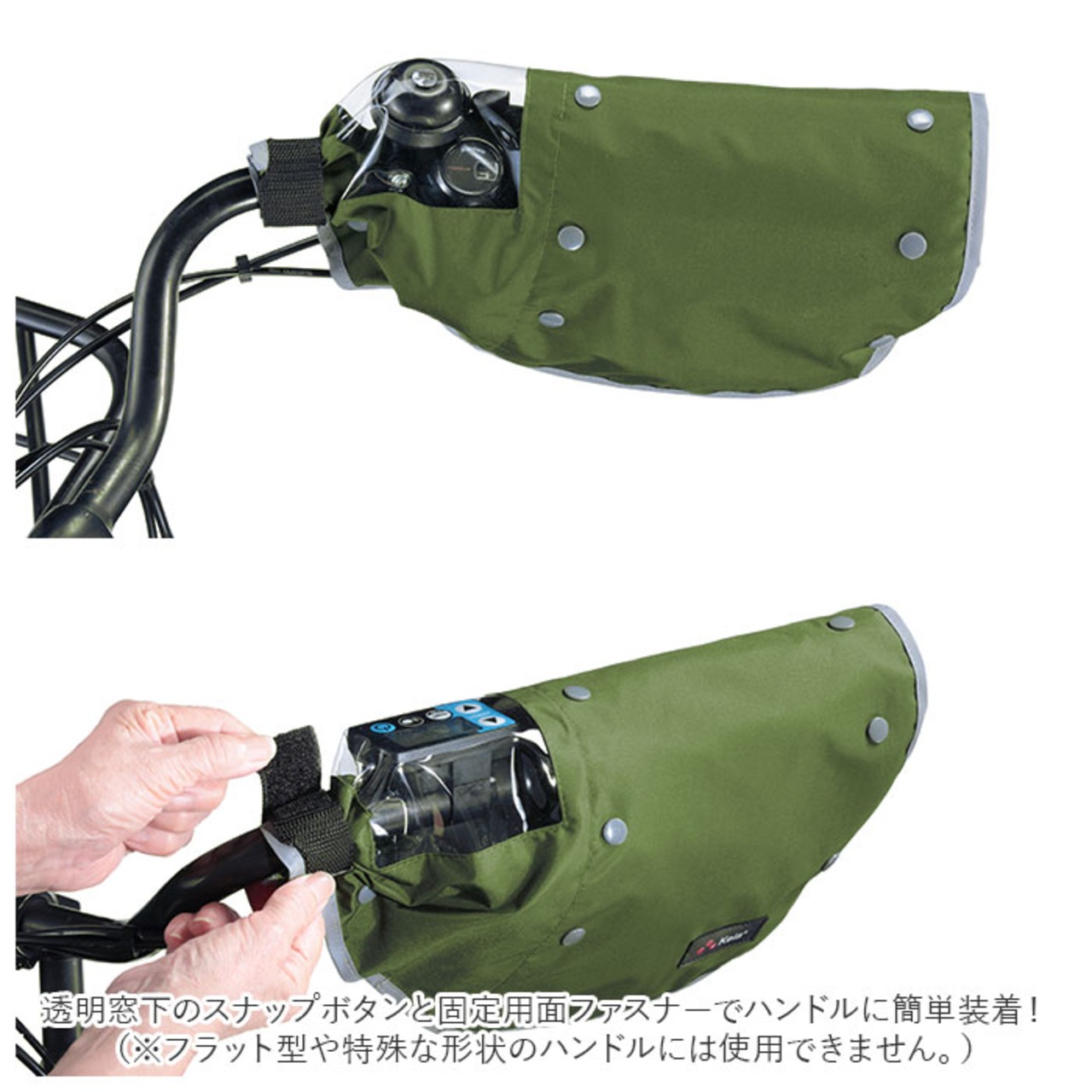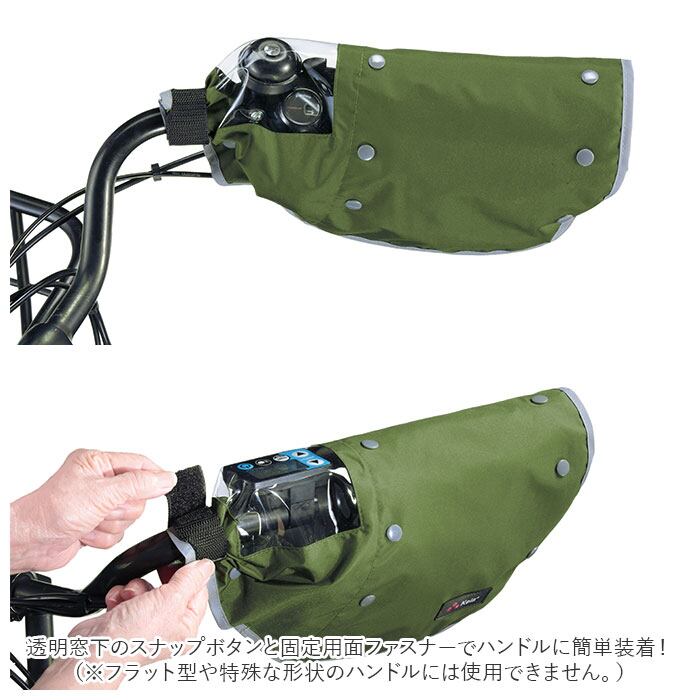 ・透明窓下のスナップボタンと固定用面ファスナーでハンドルに簡単装着!(※フラット型や特殊な形状のハンドルには使用できません。)