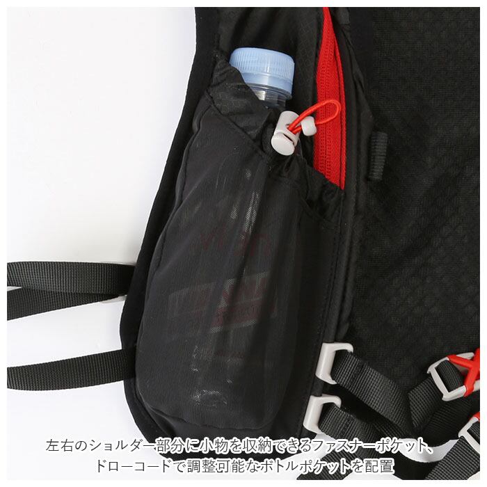 ・左右のショルダー部分に小物を収納できるファスナーポケット、ドローコードで調整可能なボトルポケットを配置。