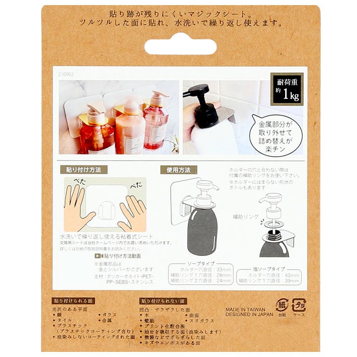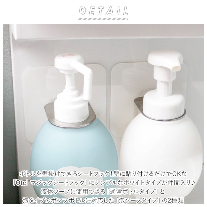 ・シャンプーやボディソープなど液体ソープに使用できる「通常ボトルタイプ」と、泡タイプのポンプボトルに対応した「泡ソープタイプ」の2種類。