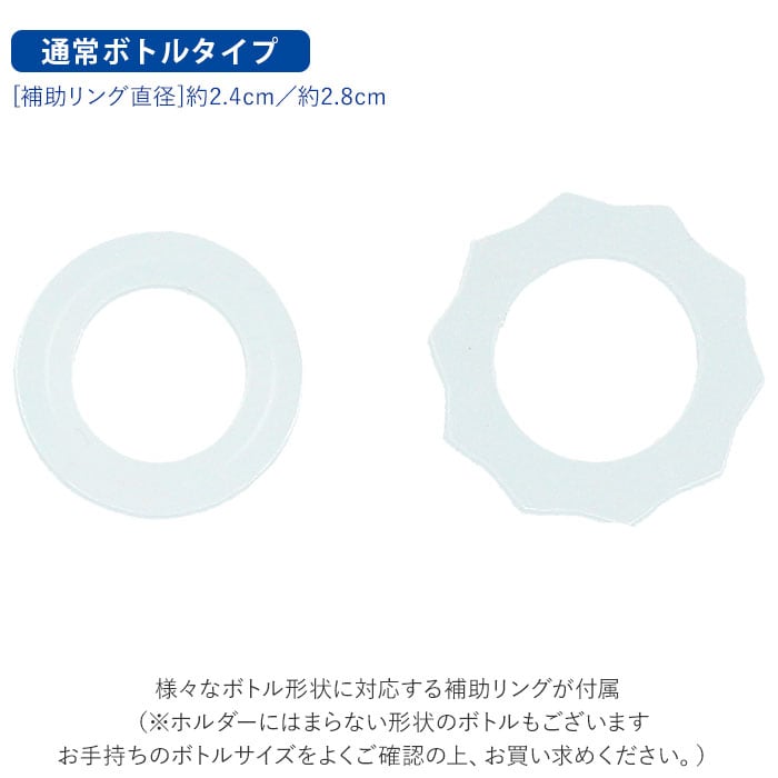 ・様々なボトル形状に対応する補助リングが付属。(※ホルダーにはまらない形状のボトルもございます。お手持ちのボトルサイズをよくご確認の上、お買い求めください。)