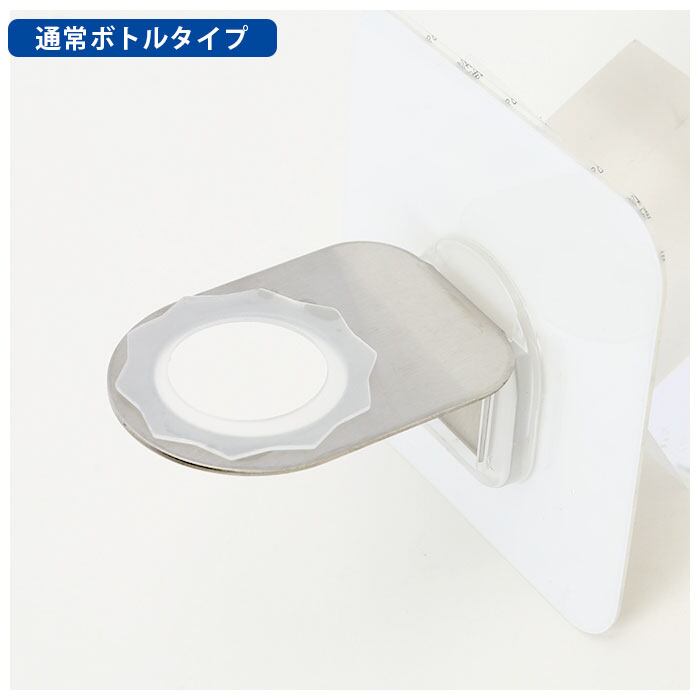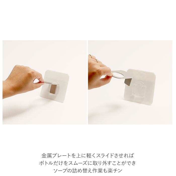 ・金属プレートを上に軽くスライドさせれば、ボトルだけをスムーズに取り外すことができ、ソープの詰め替え作業も楽チン。