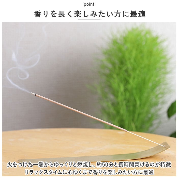 ・火をつけた一端からゆっくりと燃焼し、約50分と長時間焚けるのが特徴。リラックスタイムに心ゆくまで香りを楽しみたい方に最適。