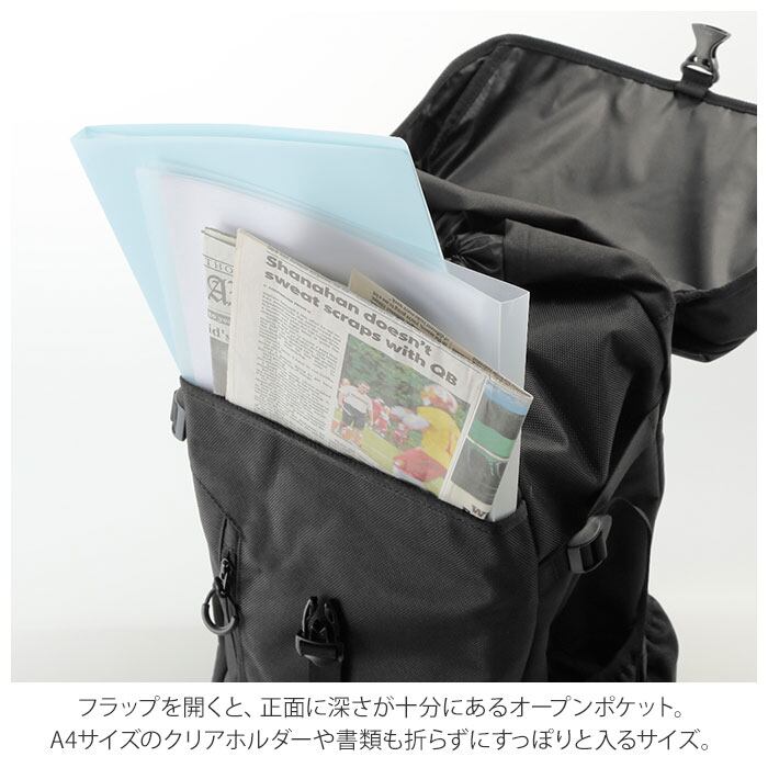 ・差し込みバックル式のフラップを開くと、正面に深さが十分にあるオープンポケット。A4サイズのクリアホルダーや雑誌も折らずにすっぽりと入るサイズ。