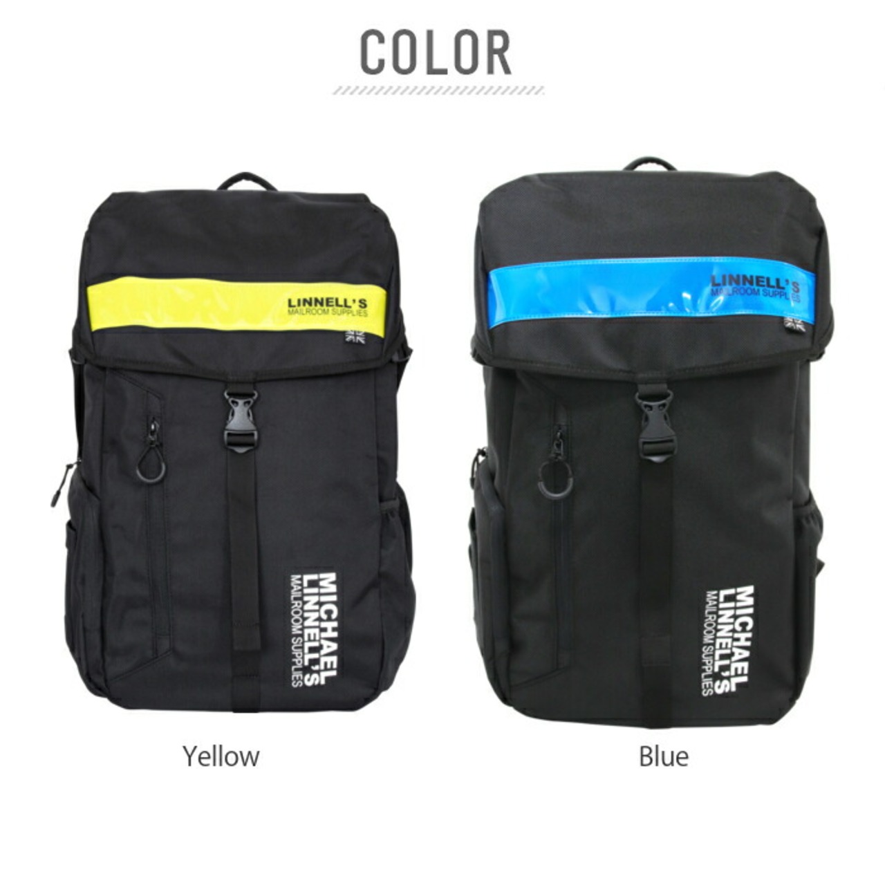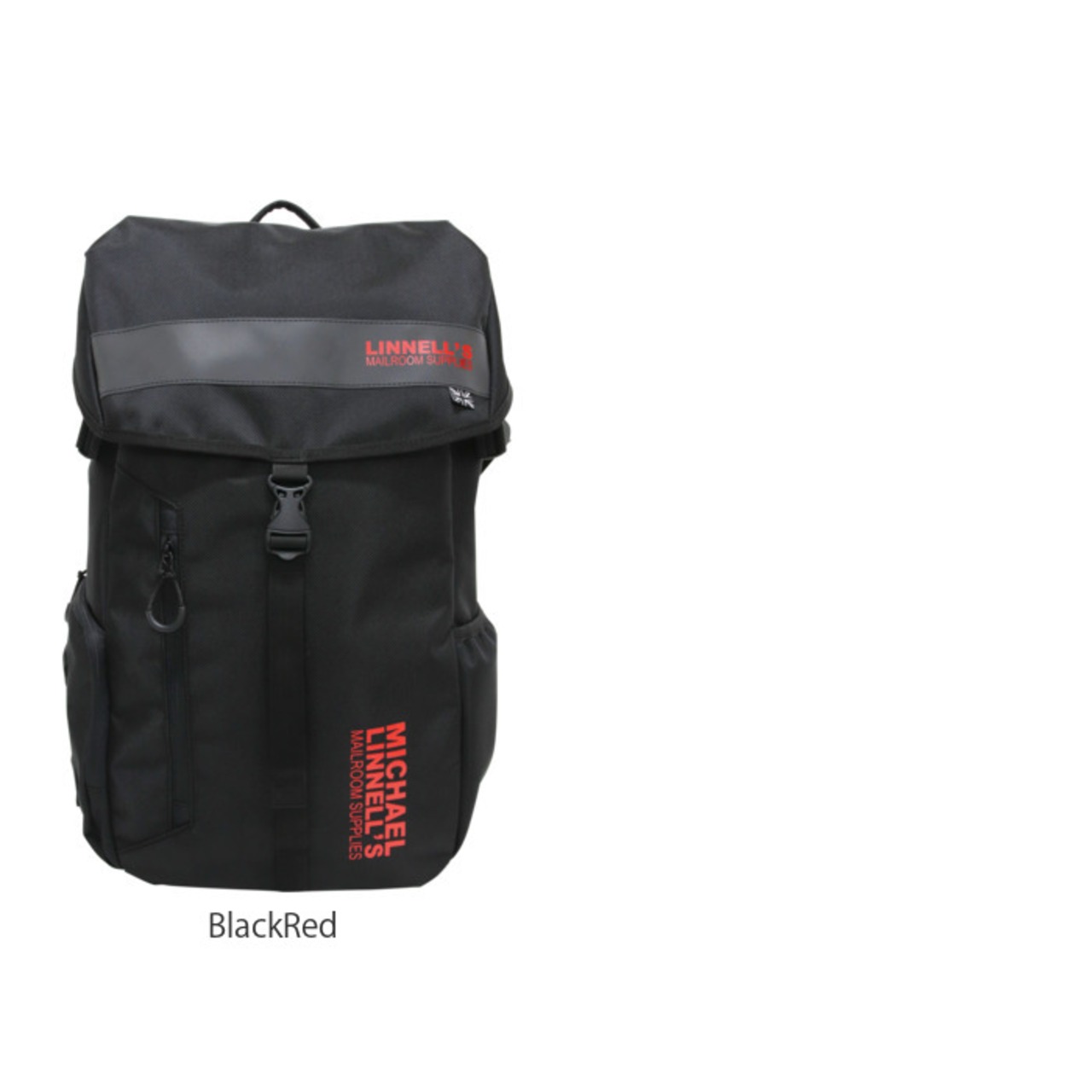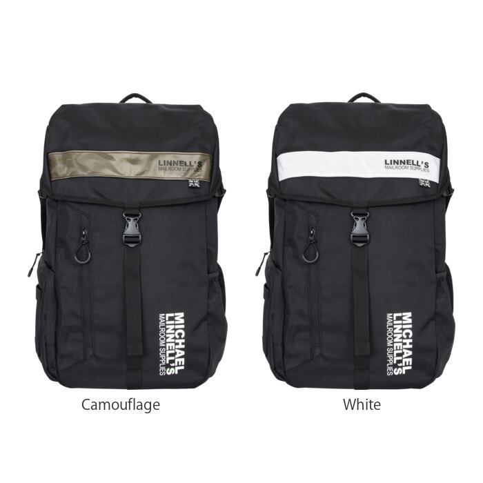 ・前面フラップに水平に配置されたリフレクター素材と、「LINNEL'S MAILROOM SUPPLIES」のロゴとモノトーンのユニオンジャックタグが印象的なビッグバックパック。