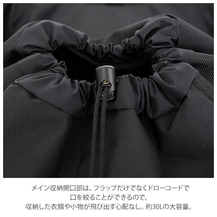 ・メイン収納開口部は、フラップだけでなくドローコードで口を絞ることができるので、収納した衣類や小物が飛び出す心配なし。約30Lの大容量。