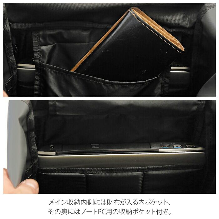 ・メイン収納内側には、標準的な長財布が収まる内ポケットに、背面側にはタブレット端末やノートPC用の収納ポケット付き。