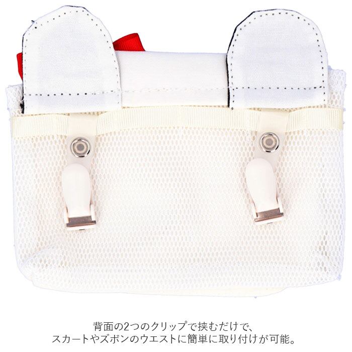・背面の2つのクリップで挟むだけで、スカートやズボンのウエストに簡単に取り付けが可能。レッスンバッグの開口部にちょこんとくっつけてもOK!