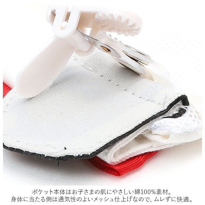 ・ポケット本体はお子さまの肌にやさしい綿100%素材。身体に当たる側は通気性のよいメッシュ仕上げなので、ムレずに快適。