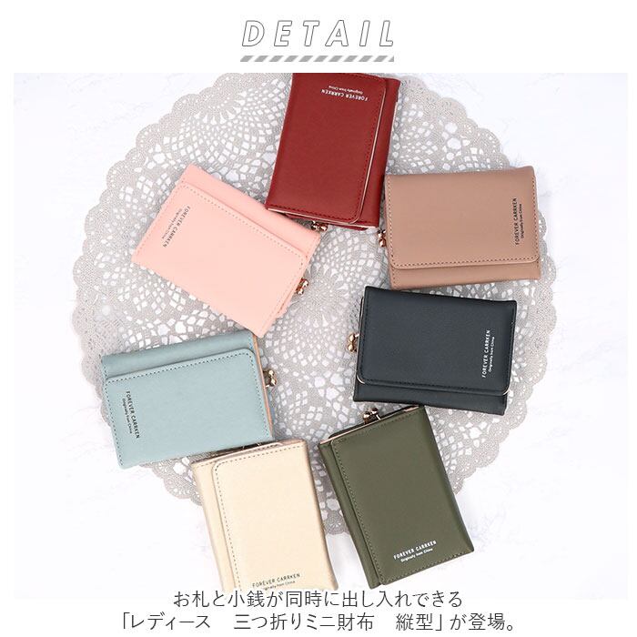 ・お札と小銭が同時に出し入れできる「レディース 三つ折りミニ財布 縦型」が登場。