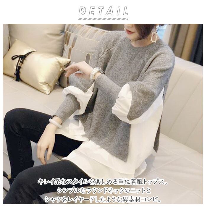 ・シンプルなラウンドネックのニットとシャツをレイヤードしたような異素材コンビ。