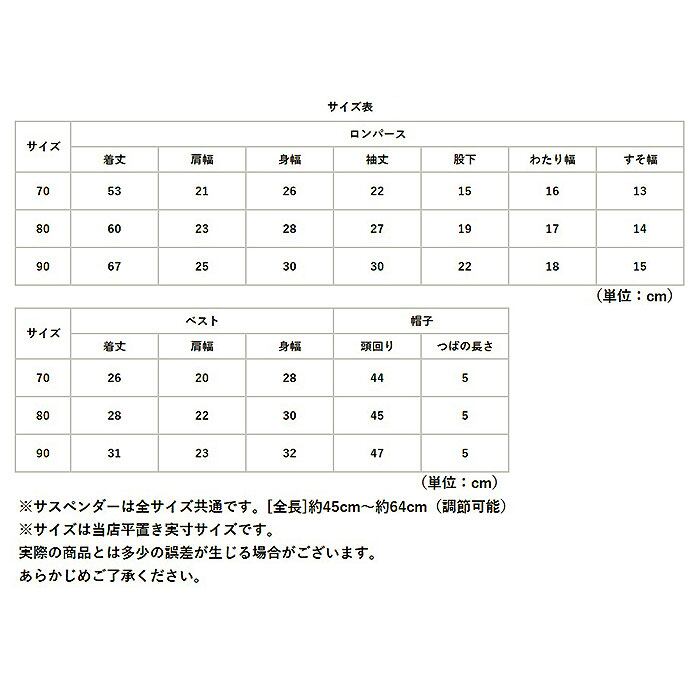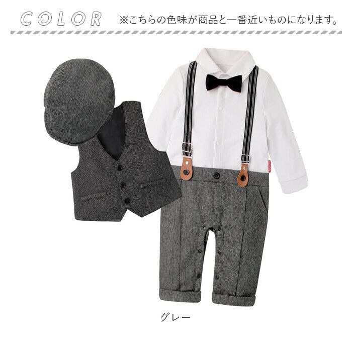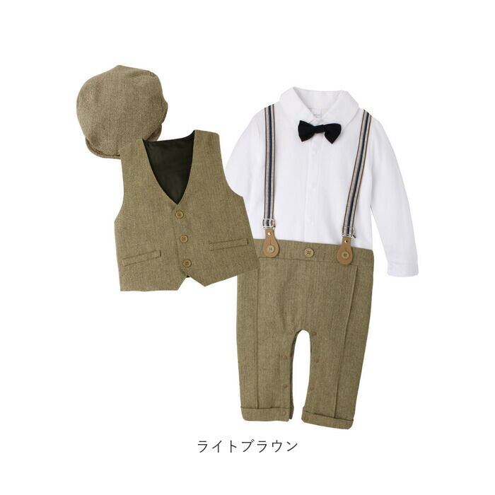 ・ロンパース、ベスト、帽子、サスペンダーの4点セット。