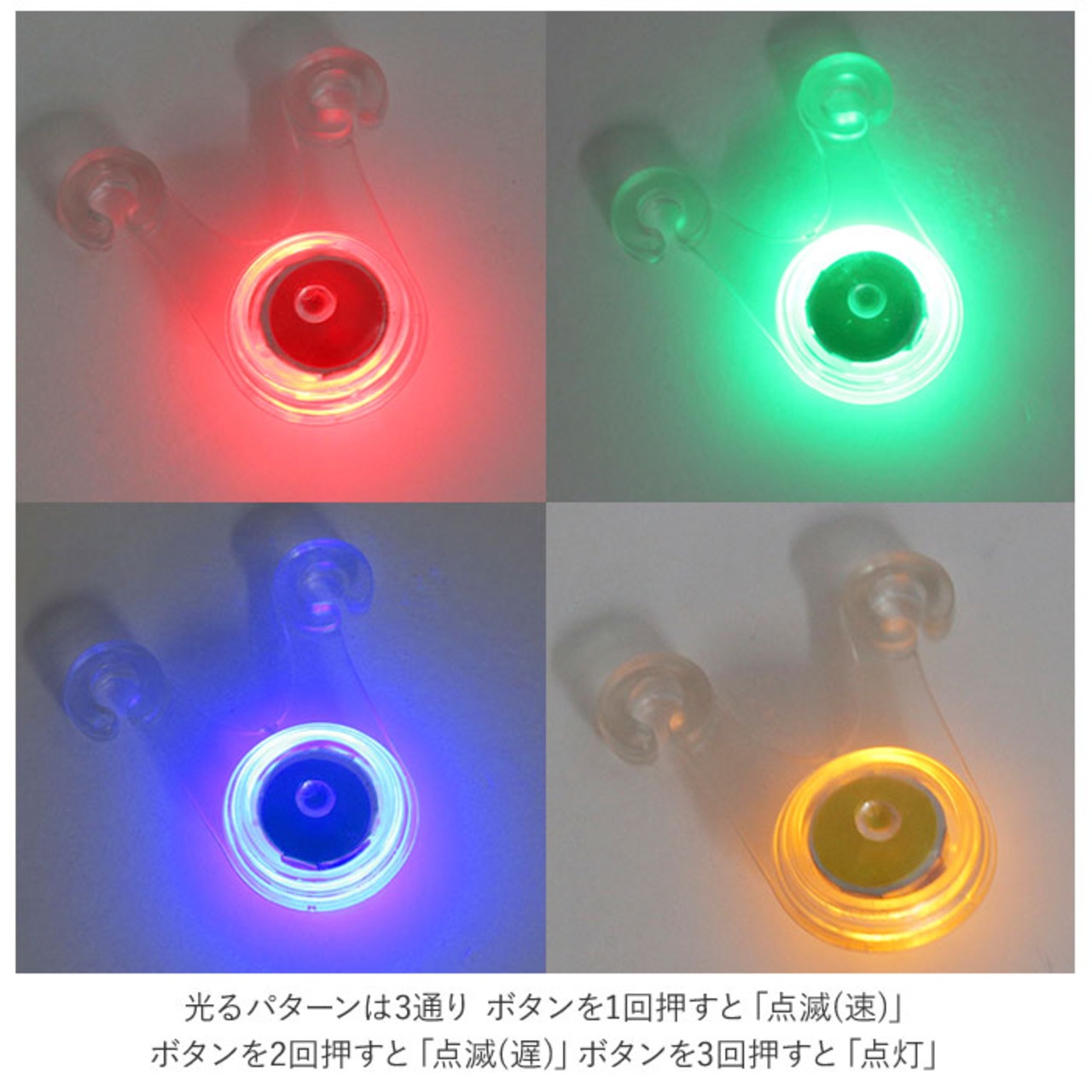 ・光るパターンは3通り。ボタンを1回押すと「点滅(速)」ボタンを2回押すと「点滅(遅)」ボタンを3回押すと「点灯」(※カラフルのみ点灯モードがなく代わりに色が変化するレインボーモードになります。)