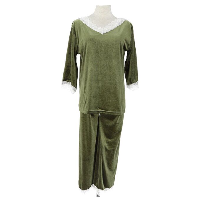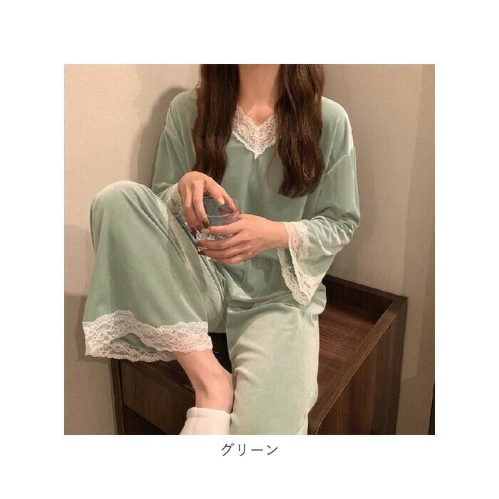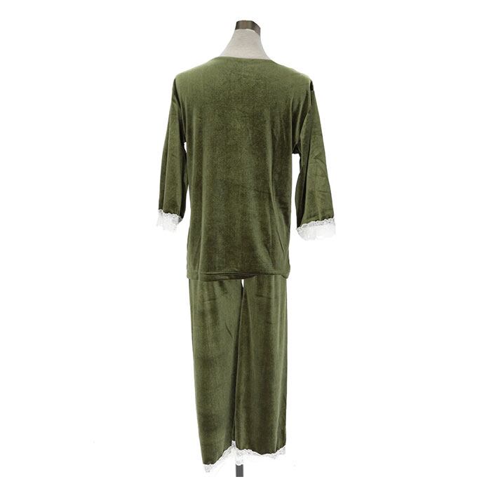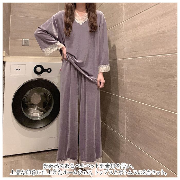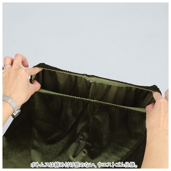 ・光沢感のあるベルベット調素材を使い、上品な印象に仕上げたルームウェア。トップスとボトムスの2点セット。