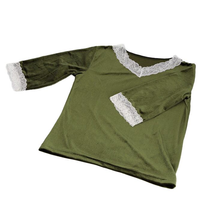 ・トップスの襟元、袖口、ボトムスの裾にレースを施し、可愛さアップ!