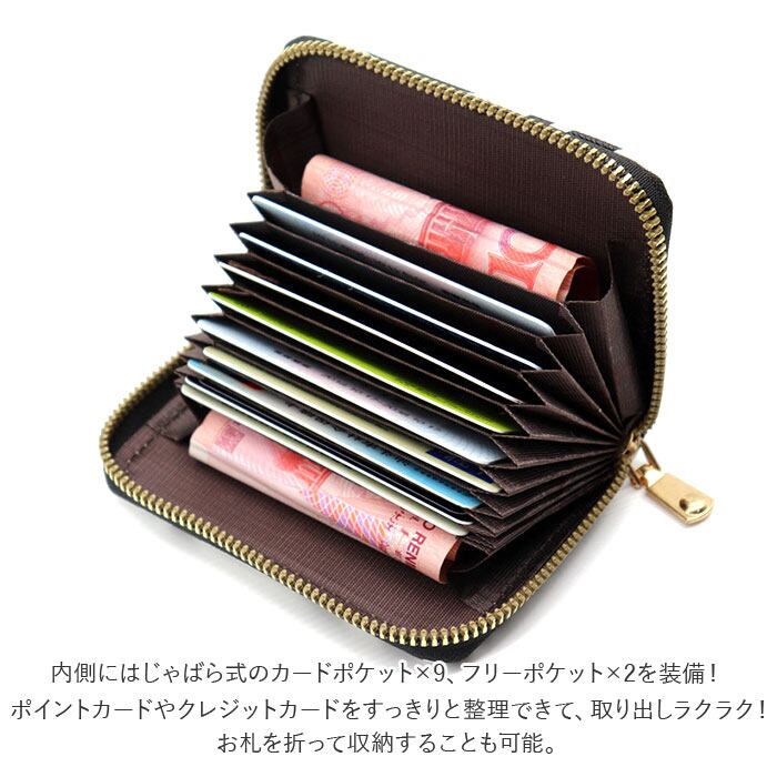 ・内側にはじゃばら式のカードポケット×9、フリーポケット×2を装備。